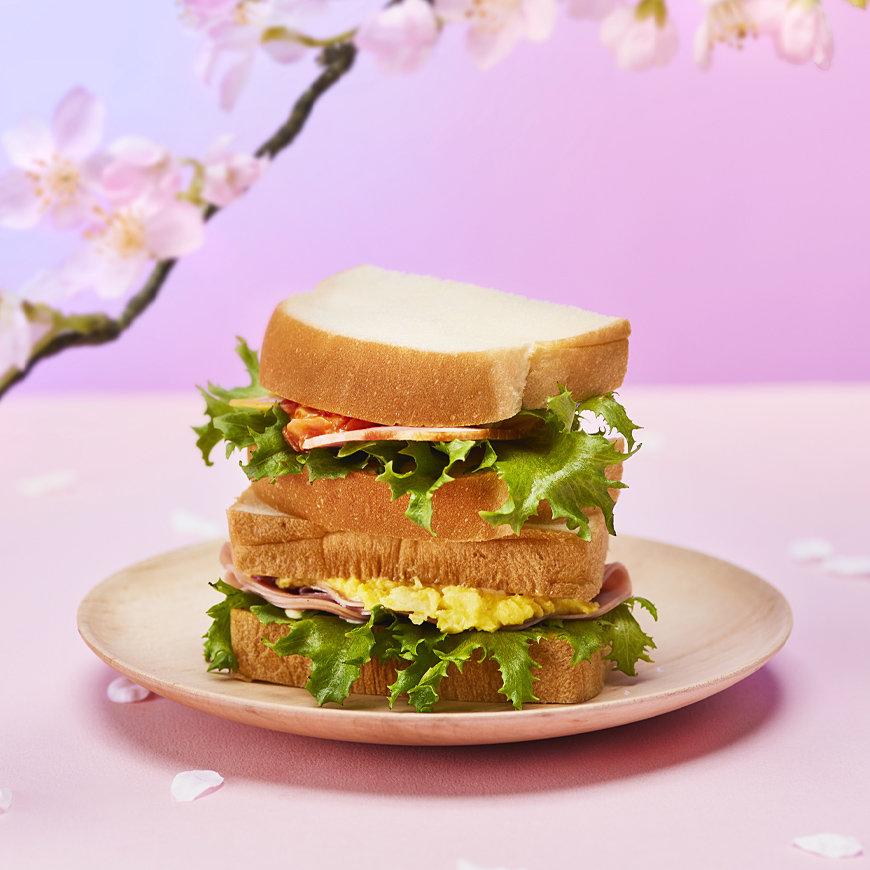 ベーコンやレタス、チーズなどをふんわりとしたパンにはさんだ、彩り豊かで具だくさんなサンドイッチです。
