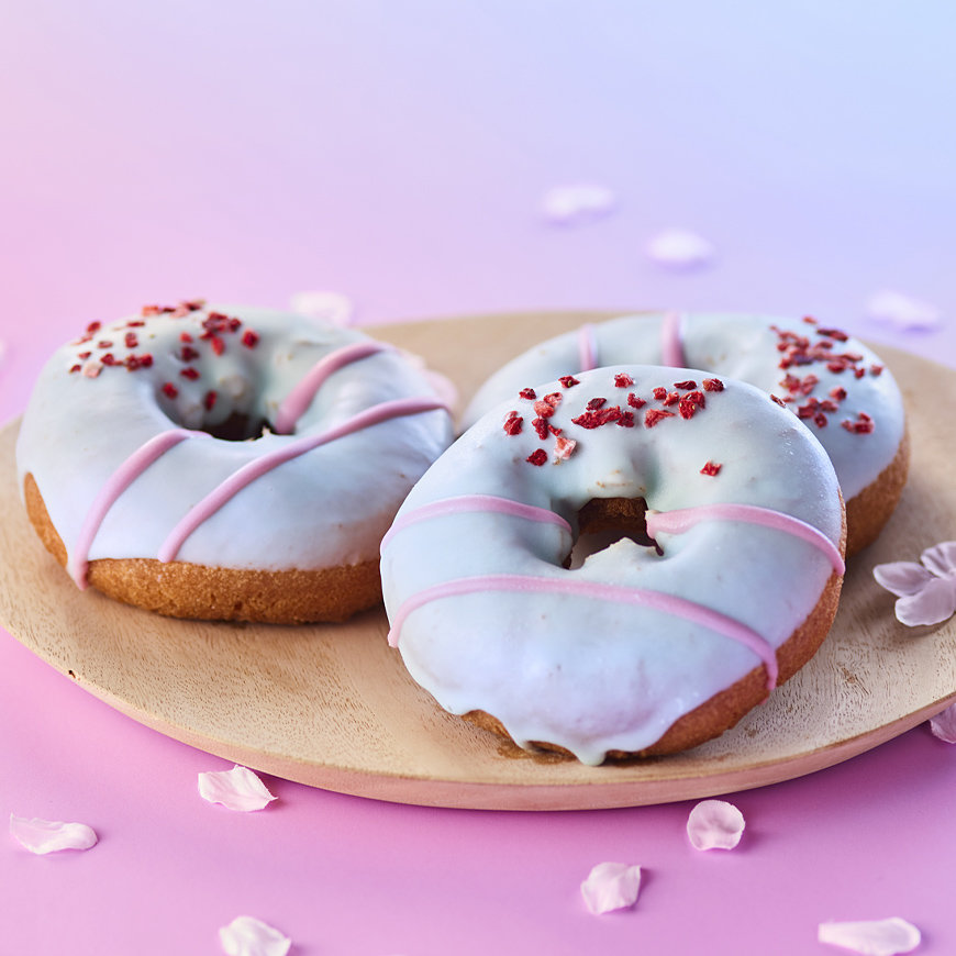 しっとりとしたケーキドーナツを桜がふわっと香るブルーのチョコでコーティング。華やかな見た目に仕上げました。
